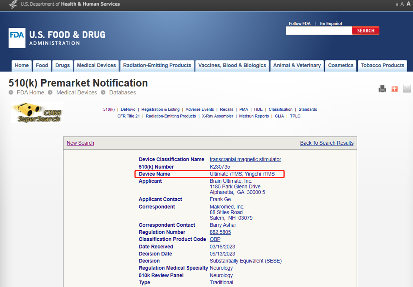2023年9月,深圳英智科技有限公司自主研發的M系列經顱磁刺激儀(transcranial magnetic stimulation, TMS)正式獲得FDA批準,用于重度抑郁障礙(Major Depressive Disorder, MDD)的治療(K230735)。這意味著“英..