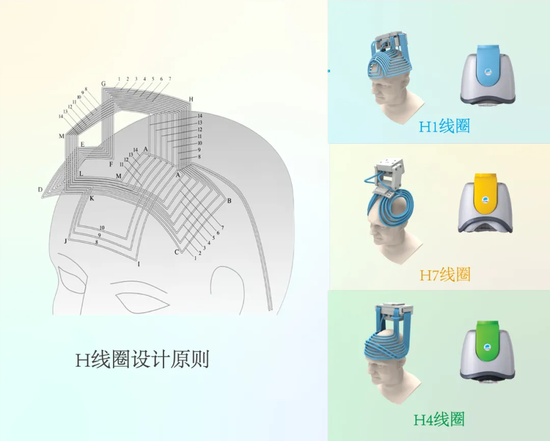 ▲ H 線圈設計原則示意圖和3種FDA批準商業線圈。與常規線圈相比,H線圈切向線圈元件大量增加,非切向元件減少。(磁耦合:鄰近線圈組件之間通過電流變化,可在彼此線圈附近產生感應磁場,通過自身線圈產生的磁場和臨近線圈賦予的磁場疊加,達到更強的磁場強度和更少的磁場衰減。)
