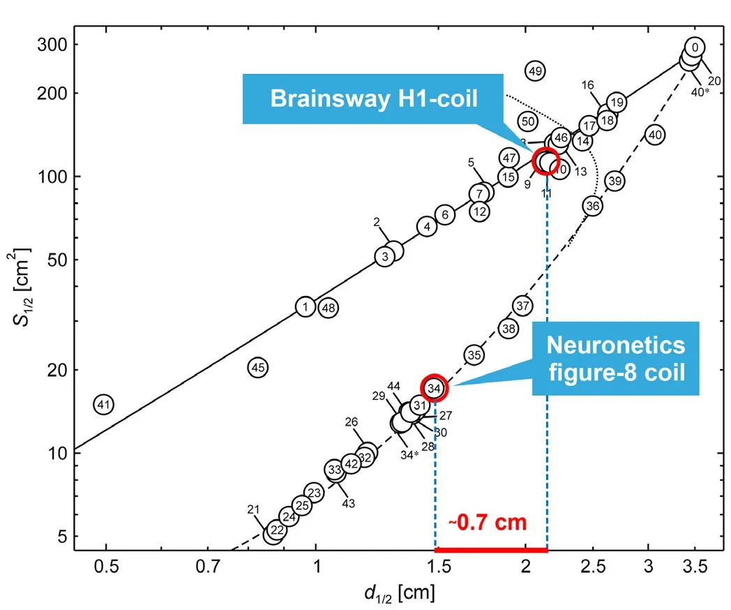 ▲H1線圈和8字形線圈感應的電場分布圖,基于在充滿生理鹽水溶液的模型頭中的測量結果。紅色像素表示高于神經元激活閾值(100V/m)的電場幅度。以120%閾值強度刺激時,H1線圈在1.8厘米深度處誘導超閾值電場,而8字形線圈可誘發超閾值電場的深度僅為0.7厘米。