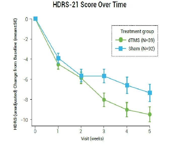 來自以色列、德國、美國、加拿大等國家的研究者開展了首項全球多中心雙盲對照研究,并發表于權威精神病學期刊《世界精神病學》。該研究于全球20個中心開展,共納入了233名抑郁癥患者,在4周的急性期治療內接受了20次dTMS治療,研究主要療效終點為21項漢密爾頓抑郁量表(HDRS-21)總分自基線至第5周的變化情況,次要療效終點為第5周時的有效/治愈率。