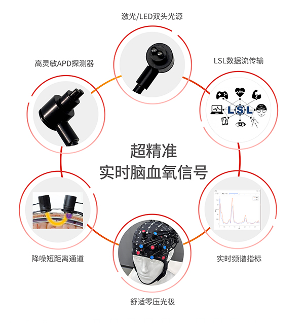 內置短通道檢測,有效分離淺層信號,提高腦皮層數據真實性;高靈敏LED光源和主動探測器保證數據質量。