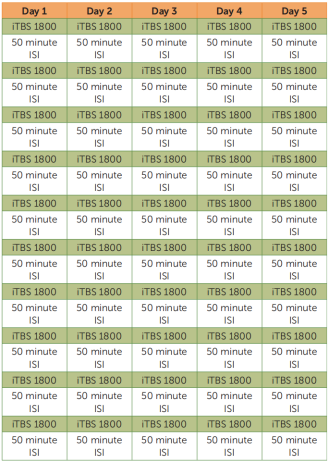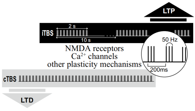 通過(guò)多年研究,最終確定TBS模式為:3個(gè)50Hz的爆發(fā)刺激為一叢或簇,叢或簇間以5Hz的間隔頻率刺激,總共600脈沖,刺激強(qiáng)度為80%AMT。當(dāng)連續(xù)刺激時(shí),持續(xù)時(shí)間為40秒(600個(gè)脈沖),稱為連續(xù)爆發(fā)刺激或“cTBS”,該模式刺激會(huì)分別在刺激后導(dǎo)致MEP和皮質(zhì)脊髓活動(dòng)的LTD樣減少并持續(xù)20或60分鐘。相反,間歇性爆發(fā)刺激(iTBS)中連續(xù)刺激2s,間歇8s,總共600脈沖,用時(shí)190s。該模式導(dǎo)致MEP大小和興奮性的顯著LTP樣增加,持續(xù)20分鐘。[2][3]