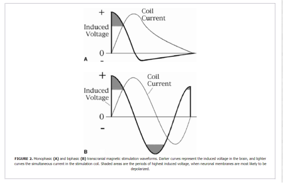 The resulting pulse waveforms are determined by the resonant frequency of the capacitor plus coil. These waveforms fall into two categories: (a) monophasic and (b) biphasic. “Monophasic” magnetic pulses have the general shape illustrated in FIGURE 2A, with a large initial peak and a much smaller, longer-lasting tail that presumably has no biologic effect. Biphasic pulses form a cosine wave, as shown in FIGURE 2B, with the later peaks smaller than the first because of energy losses in the circuitry.